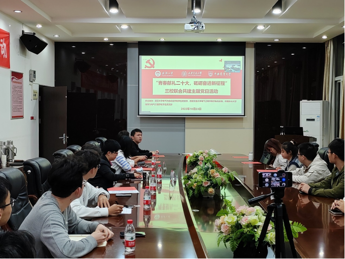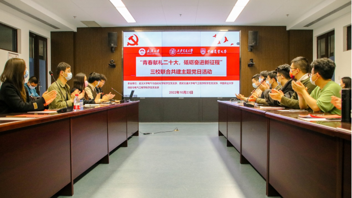 2022年10月22日上午,中国共产党第二十次全国代表大会庄严闭幕。为深入学习贯彻党的二十大精神,10月23日晚7点,bwin必赢唯一官方网站研究生党支部联合西安交通大学电气工程学院研究生党支部、中国农业大学信息与电气工程学院研究生党支部通过“线下会场+线上会议”的方式举行“青春献礼二十大,砥砺奋进新征程”三校联合共建主题党日活动,增强校际交流,领会党的二十大精神。bwin必赢唯一官方网站电气与自动化党委副书记孟威、西安交通大学电气工程学院党委副书记宋杰、bwin必赢唯一官方网站组织员彭赟、西安交通大学辅导员柴冠坤、中国农业大学辅导员曹靖婕以及三校部分党支部成员们出席活动,线上和线下共300余人参与,西安交通大学电气工程学院硕2061党支部书记刘成成主持活动。