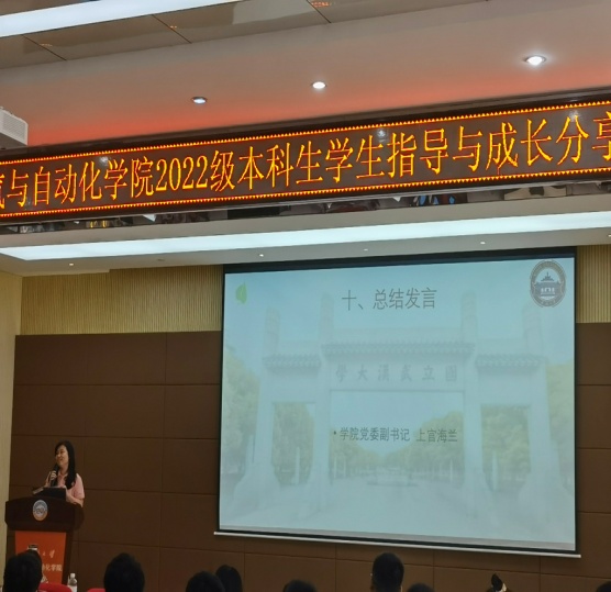 学院党委副书记上官海兰总结发言。她告诫同学们大学生务必把学习放在首位,鼓励同学们走进实验室、积极参加社团、志愿活动提升综合素养。她希望同学们安心学习,遵守学生守则,牢固法律观念,做有理想、有抱负、爱祖国的中国青年。
