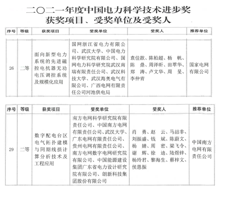 其中,袁佳歆教授、陈柏超教授、田翠华副教授等老师的项目《面对新型电力系统的先进磁控电抗器无功电压调控系统及规模化应用》获中国电力科学技术进步奖二等奖,刘振盛、杨玲君等老师的项目《数字配电台区电气拓扑建模与同期线损计算分析技术及工程应用》获中国电力科学技术进步奖二等奖,宋斌副教授等老师的项目《10-500kV复合材料杆塔关键技术及应用》获中国电力科学技术进步奖三等奖,杜志叶教授等老师的项目《特高压换流变压器电气性能现场检测技术及成套装置》获中国电力科学技术进步奖三等奖。