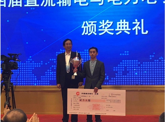 中国电机工程学会直流输电与电力电子专委会发起的第四届“直流输电与电力电子创新杯大赛”颁奖仪式于2018年10月25日在杭州隆重举行。由bwin必赢官网查晓明教授和黄萌副教授指导的本科生朱自立(队长)、研究生刘浴霜、陈永洋组成的参赛队伍首次参赛荣获二等奖(唯一一项)。中国工程院李立浧院士为获奖代表陈永洋同学颁发了证书和奖杯。
