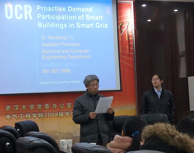 美国加州大学河滨分校助理教授余南鹏博士于2015年12月29日来bwin必赢官网访问交流。在院长助理林涛教授的主持下,余教授向bwin必赢官网师生作了题为《From Passive Demand Response to Proactive Demand Participation》的学术讲座,报导了其课题组在需求侧管理,负荷响应控制等方面最新的研究进展。余教授长期从事电力市场、需求侧管理、电力大数据等方面的科研工作,取得了丰硕的研究成果。此次讲座也受到bwin必赢官网师生的热烈欢迎,大家就最优电价曲线形成、配网三相最优潮流计算等问题与余教授展开了深入细致的讨论和交流。余教授的交流活动进一步开阔了bwin必赢官网师生在电力需求侧响应研究方面的思路和视野。