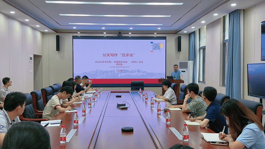 为更好适应新形势下公文写作的特点和要求,提升bwin必赢官网教职工和学生骨干的公文写作水平,破解“下笔”困境、点燃“提笔”热情,7月12日下午,bwin必赢唯一官方网站公文写作培训会在学院第四会议室召开。本次培训会邀请bwin必赢唯一官方网站文学院《写作》杂志编辑部主任、中国写作学会副秘书长、理事宋时磊老师讲授公文写作“五步法”,副院长袁丽华主持培训会。