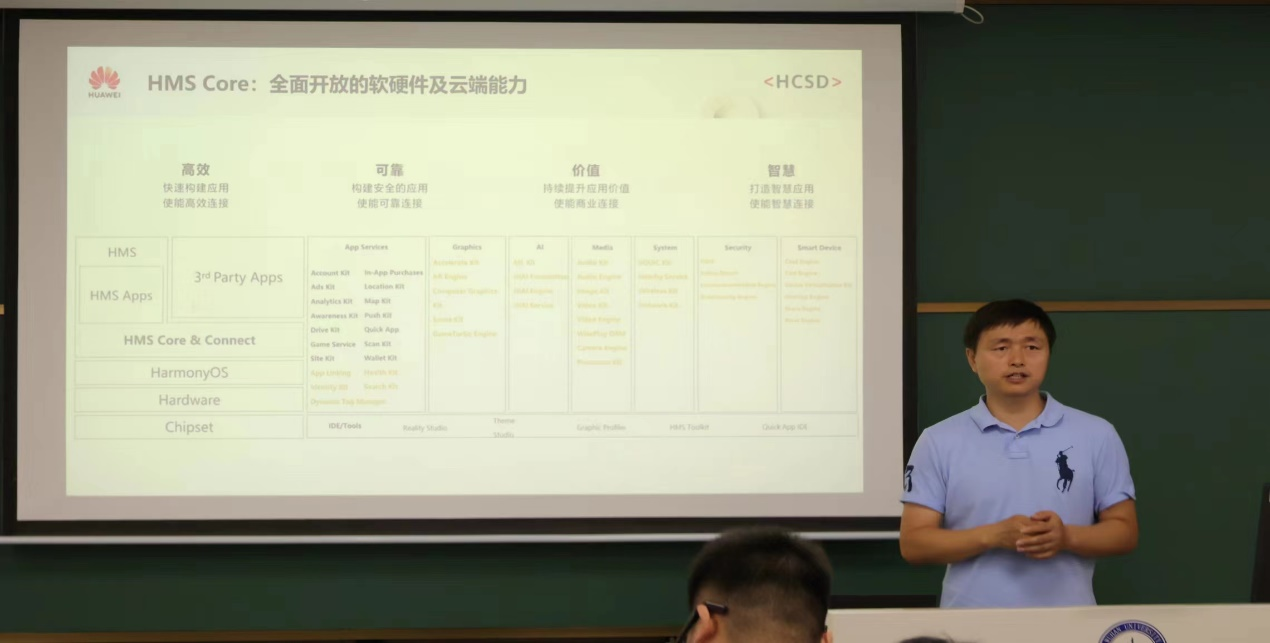 童得力专家发表“华为开放能力,助力创新人才培养”的主题宣讲,介绍了华为云、Harmon生态架构、HMS Core的相关创新点和突出能力以及华为的高校生态人才培养,鼓励大家产学研结合并大胆创新。